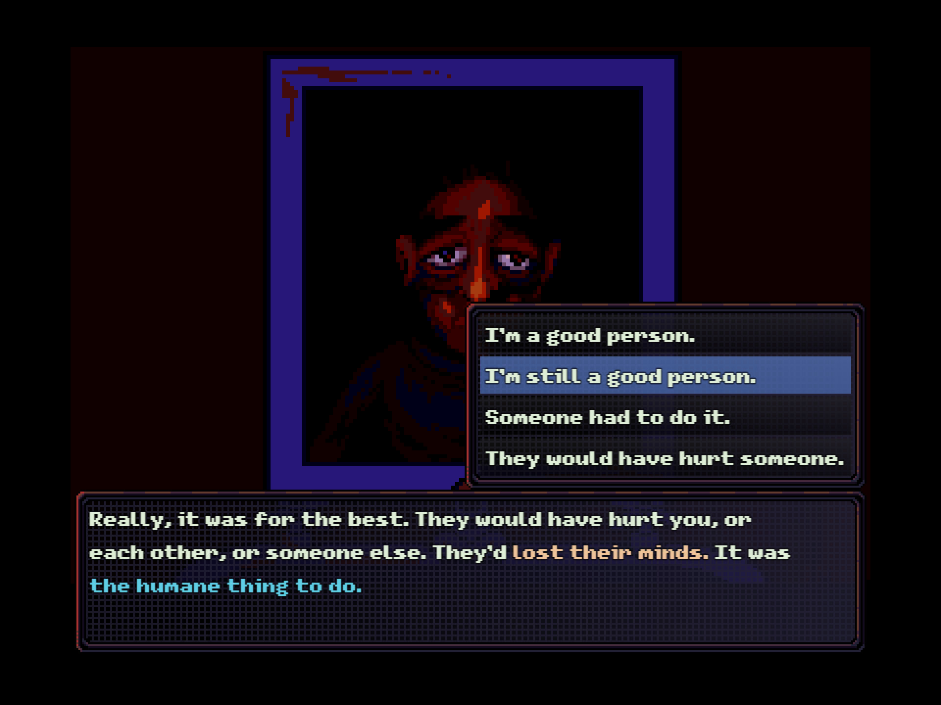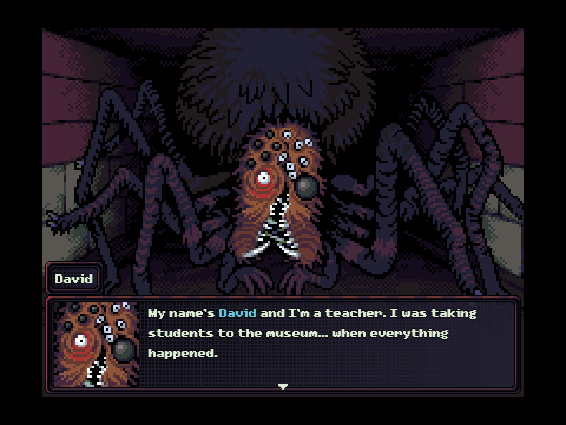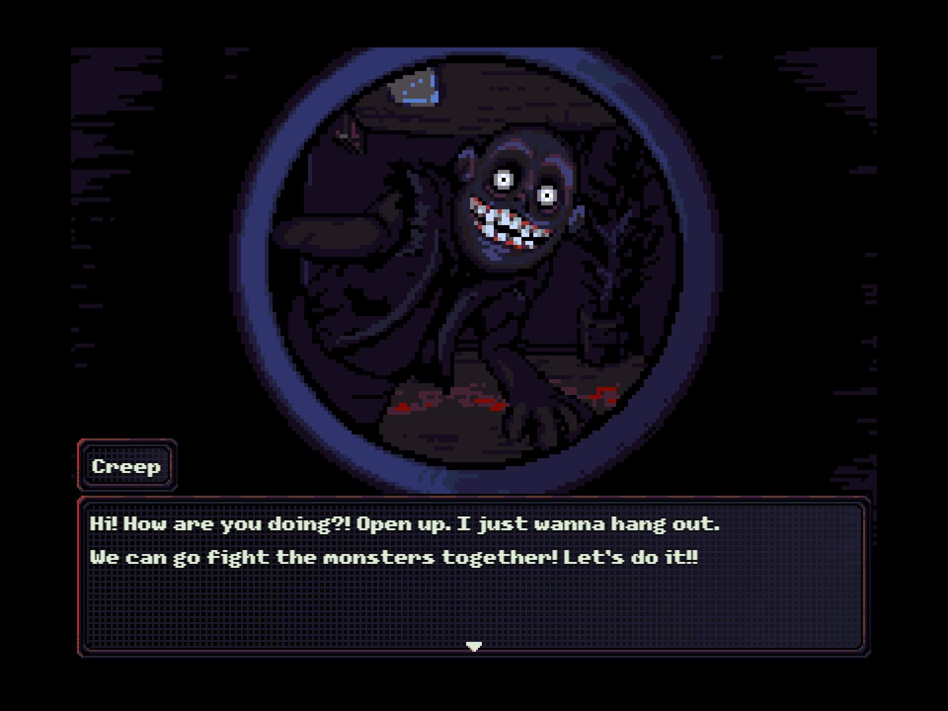 As you might’ve guessed, clearly defining Look Outside, putting the exact genre terminology on it, is a bit complicated. For all intents and purposes, it is a role playing game and it was build using the RPG Maker, so you will be recognizing a lot of very typical elements for RPGs (or jRPGs in particular). But then, there’s the non-linearity of story and mechanics, many action adventure elements and exploration that are very reminiscent of classic survival horror, odd survival game elements… It’s nuts. Though the game’s premise is extremely simple – something happened outside of your apartment building and merely taking a look out of the window will change you in ways that human mind cannot comprehend. Whatever eldritch apocalypse is happening outside, inside the building those who were affected and those who stay unaffected are simply trying to figure out what to do next. Sometimes, those who were affected turned into, essentially, mindless monsters. Sometimes those, who didn’t take a look, are weirder and more dangerous than those who did. In 15 days something will happen and the game will end, so it’s entirely up to you to decide what to do with the time that you have. You can to investigate the situation and other people’s problems, or you can just stay indoors and play videogames. The only thing that is for sure – known too much might be worse than knowing nothing.