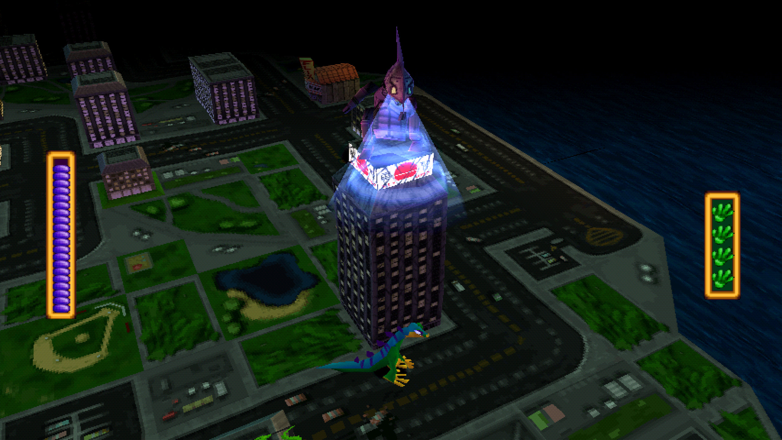 Enter the Gecko також дуже цікаво досліджувати. Гра вийшла як раз коли платформери про збір купи різних предметів на рівнях став дуже популярним. Але баланс цих предметів в цій грі дуже класно продуманий. Тому вам треба зазвичай знайти якийсь прихований пульт і також один пульт дається за підбір певної кількості предметів на рівні. Саме “певної”, а не “всіх”, і лише в пізніх рівнях це означає, що вам треба дослідити більшу частину рівню за один раз, щоб отримати цей пульт. Отримати 100% в цій частині не складно, але дуже захопливо, а якщо ви не намагаєтесь це зробити, то гра проходиться навіть швидше. Але все одно варто пройти всі рівні, бо вони дуже круті. І боси тут супер. Фінальна битва з Резом має проблеми з ґеймплеєм, але з точки зору презентації вона неймовірно крута. Мені цю частину легко рекомендувати, якщо ви можете звикнути до доволі поганої камери.
