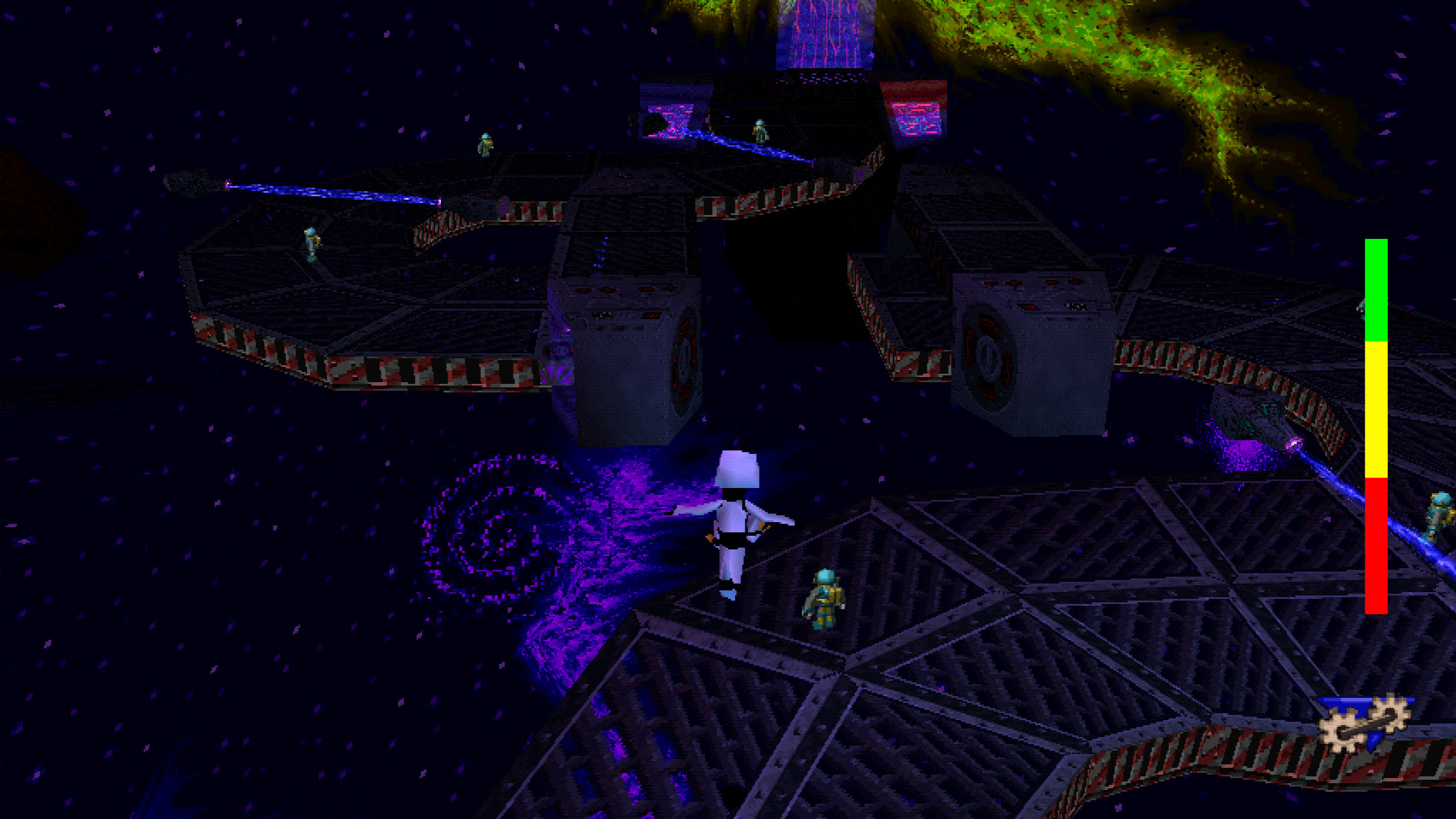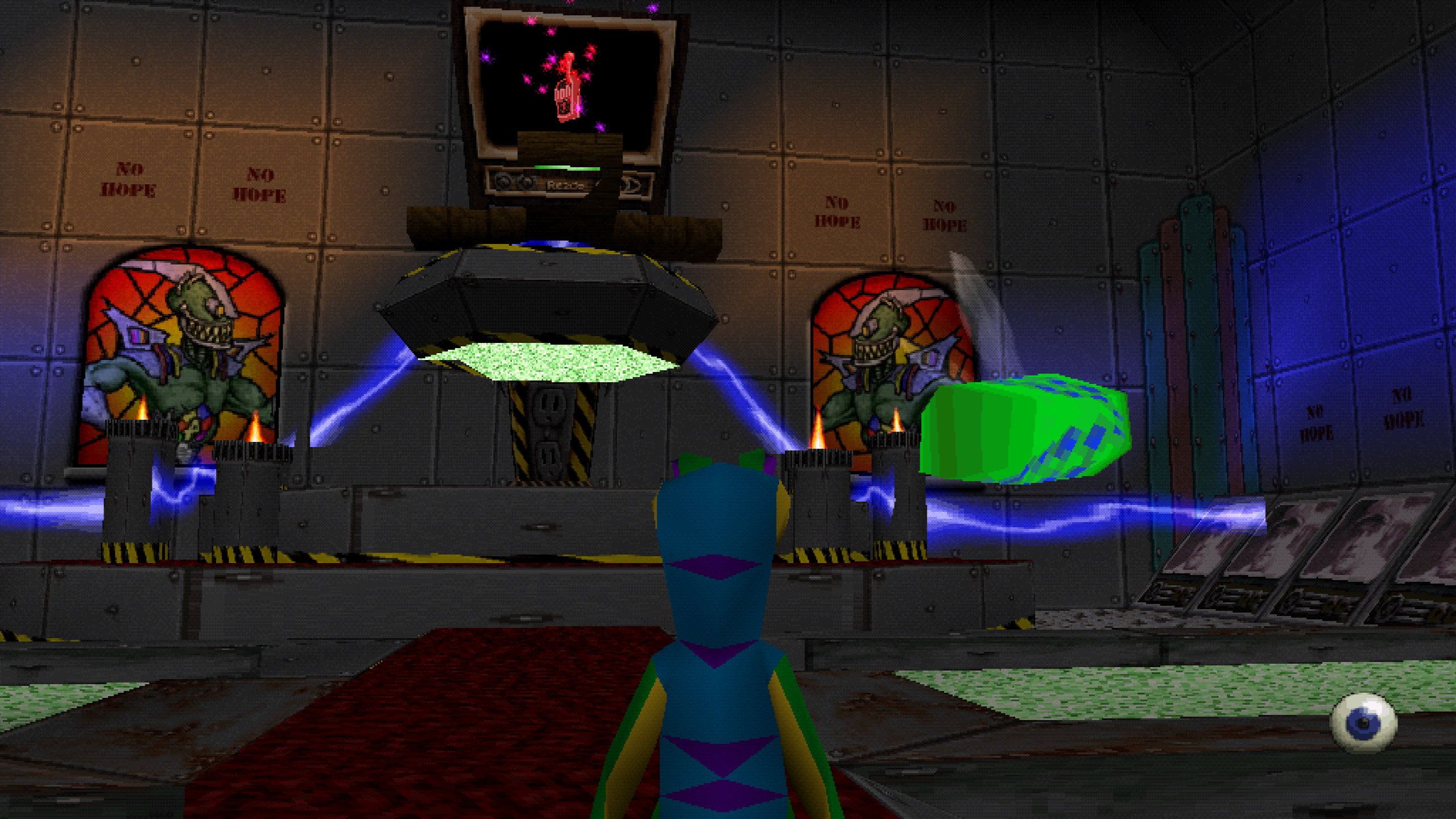 Та на цьому моя критика закінчується, бо я обожнюю цю гру. Вам варто просто витратити трохи часу, щоб звикнути до управління Гексом та камерою (я завжди використовую повністю ручний режим і, як в PS1, повертаю камеру R1/RB та L1/LB). І як тільки звикнете, то вам почне подобатись дослідження локацій та дуже унікальна атмосфера цієї частини. Бо хоча ця гра все ще просто тупа пародія без особливого сюжету, але в Enter the Gecko також багато цікавої… “антиутопічності”, мабуть. Як в класичних частинах Oddworld, тут суміш дуже “мультяшного” та дурного, з чимось дуже серйозним і реальним. Саундтрек гри це відчуття ідеально доповнює, особливо в рівнях, які напряму пов’язані з Резом, але навіть в “страшних” рівнях, чи в “світі комп’ютера” достатньо мороку, який не очікуєш побачити в грі такого плану. Не зважаючи на те, що це все залишається фоном для платформера, де гекон кидається цитатами з фільмів.