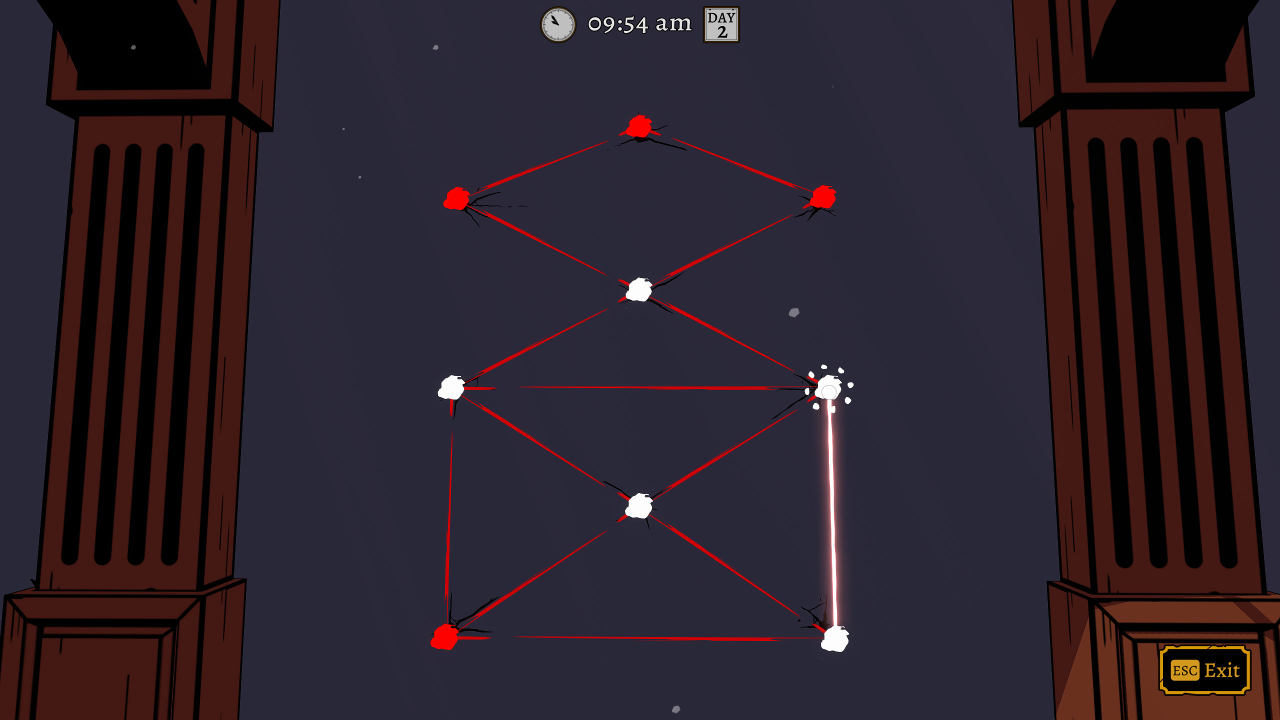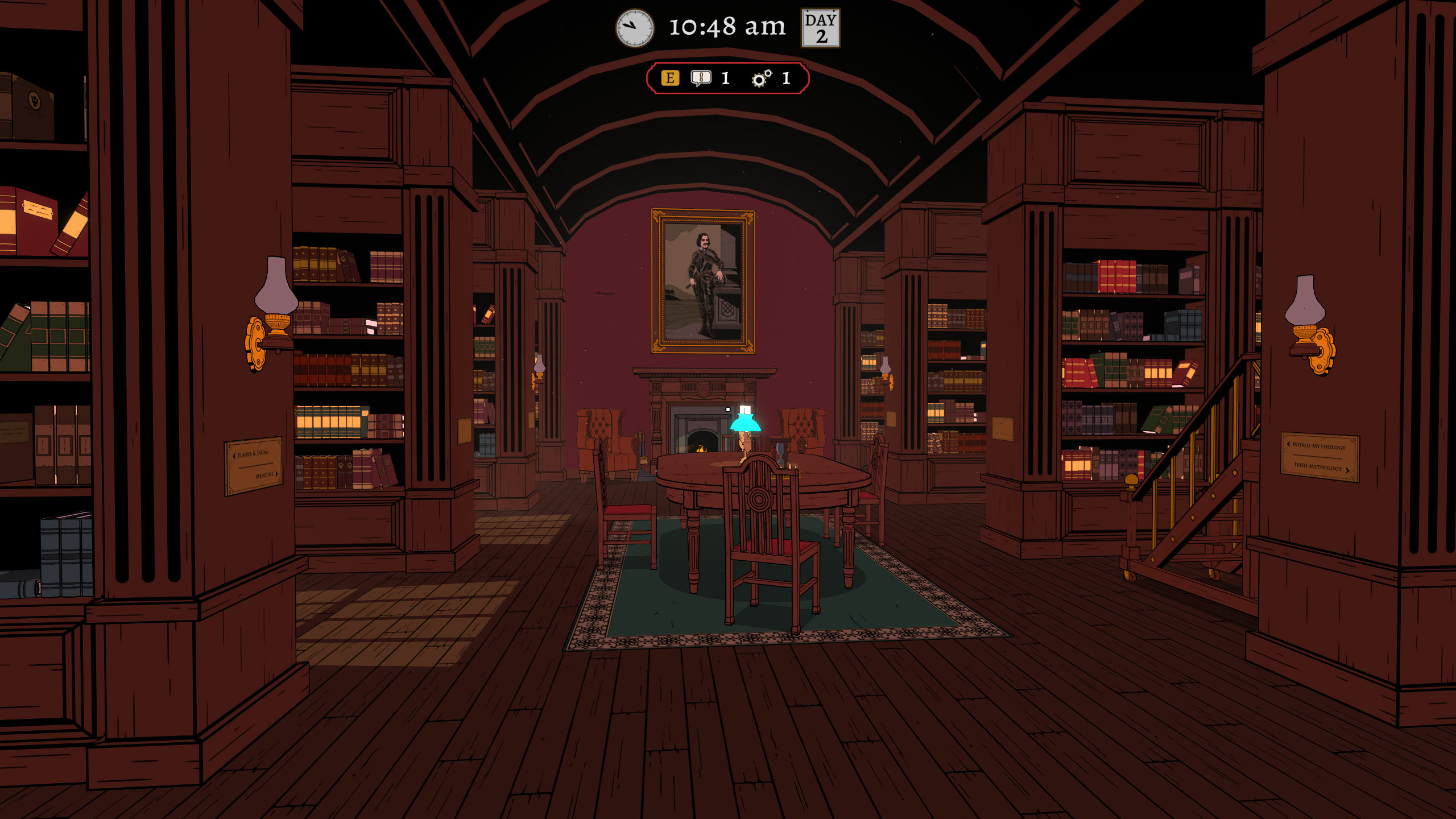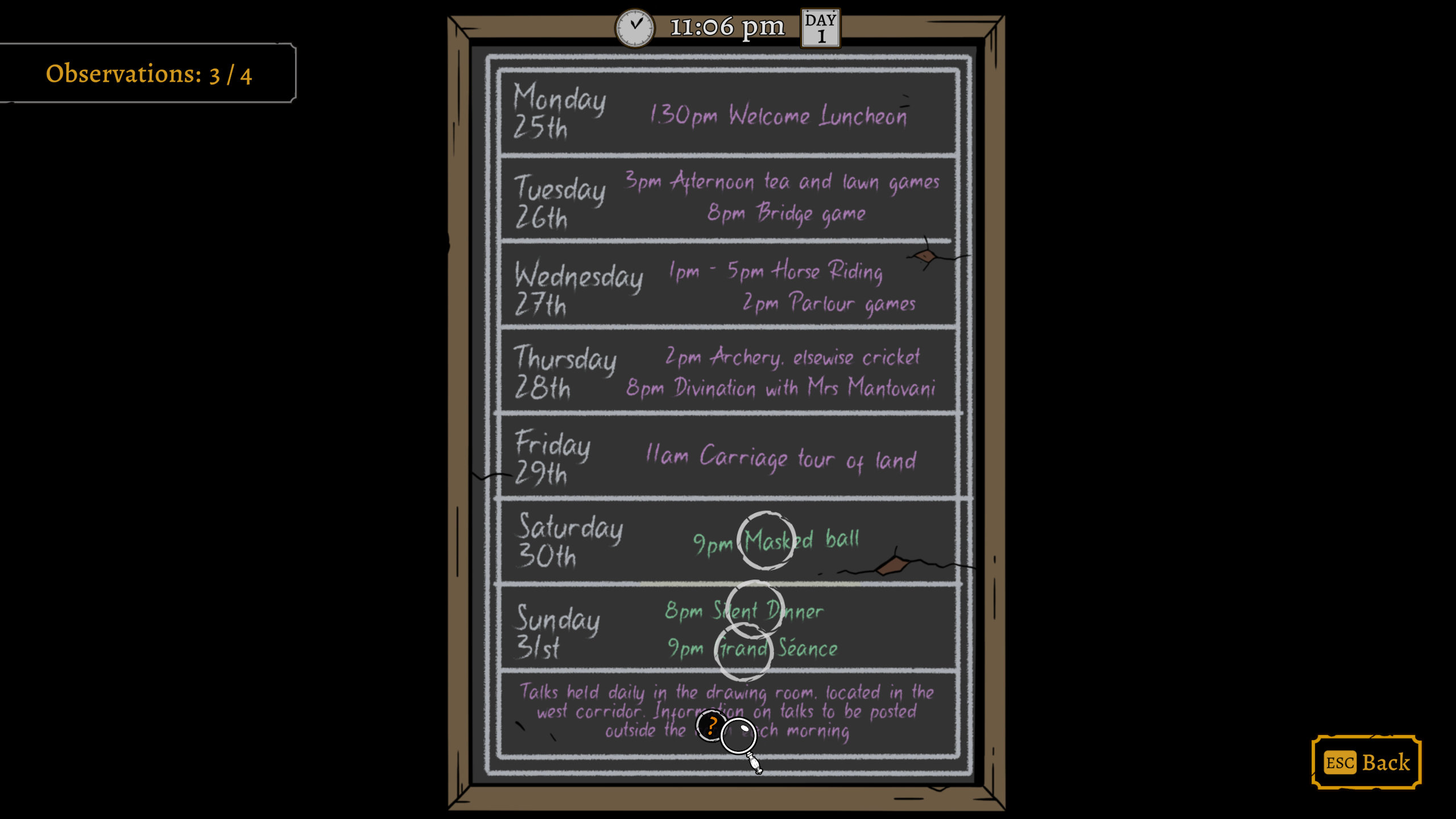 Для допомоги в розслідуванні гра має декілька елементів інтерфейсу. Одна з них – це фактично типовий “Палац пам’яті”, в якому ви зможете обачити всі доступні на зараз задачі та потенційні напрямки розслідування. В інший вкладці вся інформація, яку ви вже зібрали. Ще одна про розклад, де можна побачити чим персонажі займаються в певні години, і які події заплановані, але цю інформацію треба спочатку дізнатись. Ну і також є мапа, яка показує в якій кімнаті зараз кожен персонаж, якщо ви це знаєте за розкладом, або якщо ви зайшли в кімнату і це побачили. Інтерфейс не дуже елегантно реалізований, якщо чесно, і боюсь, що тим, хто або буде грати з великими перервами, або потребує більше допомоги з інформацією, можуть загубитись. Але в цілому він виконує свою задачу, і має купу класних деталей – наприклад, колір зв’язків між різними елементами палацу пам’яті показує, чи ви дослідили все, що могли з цього приводу, чи ні.